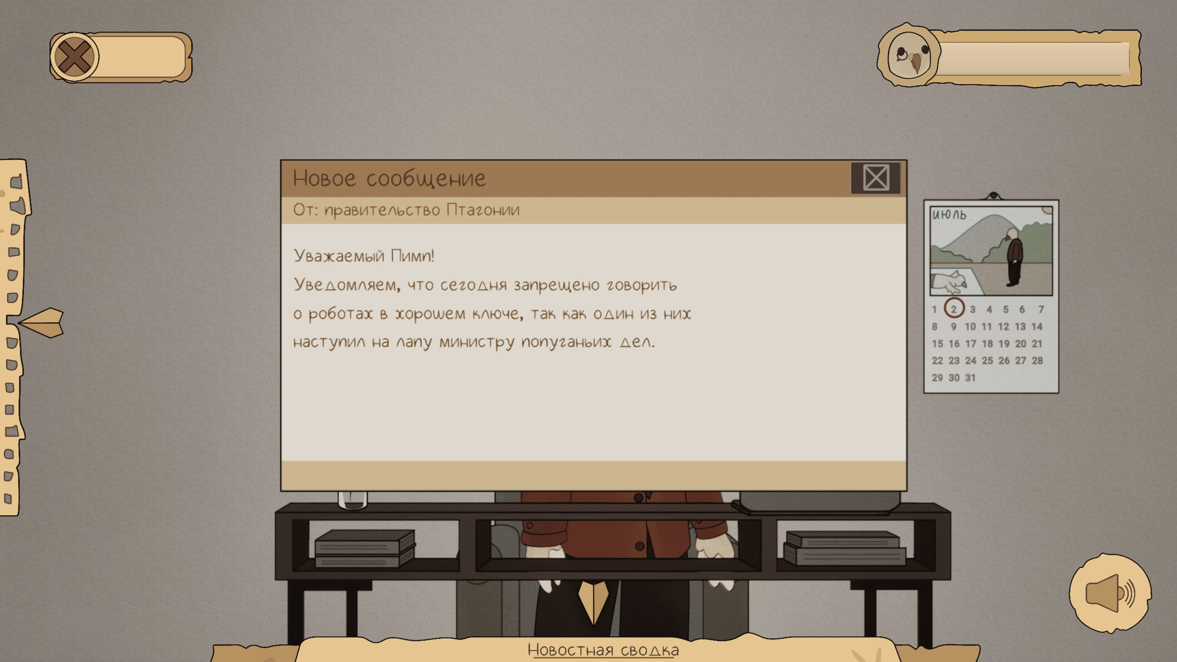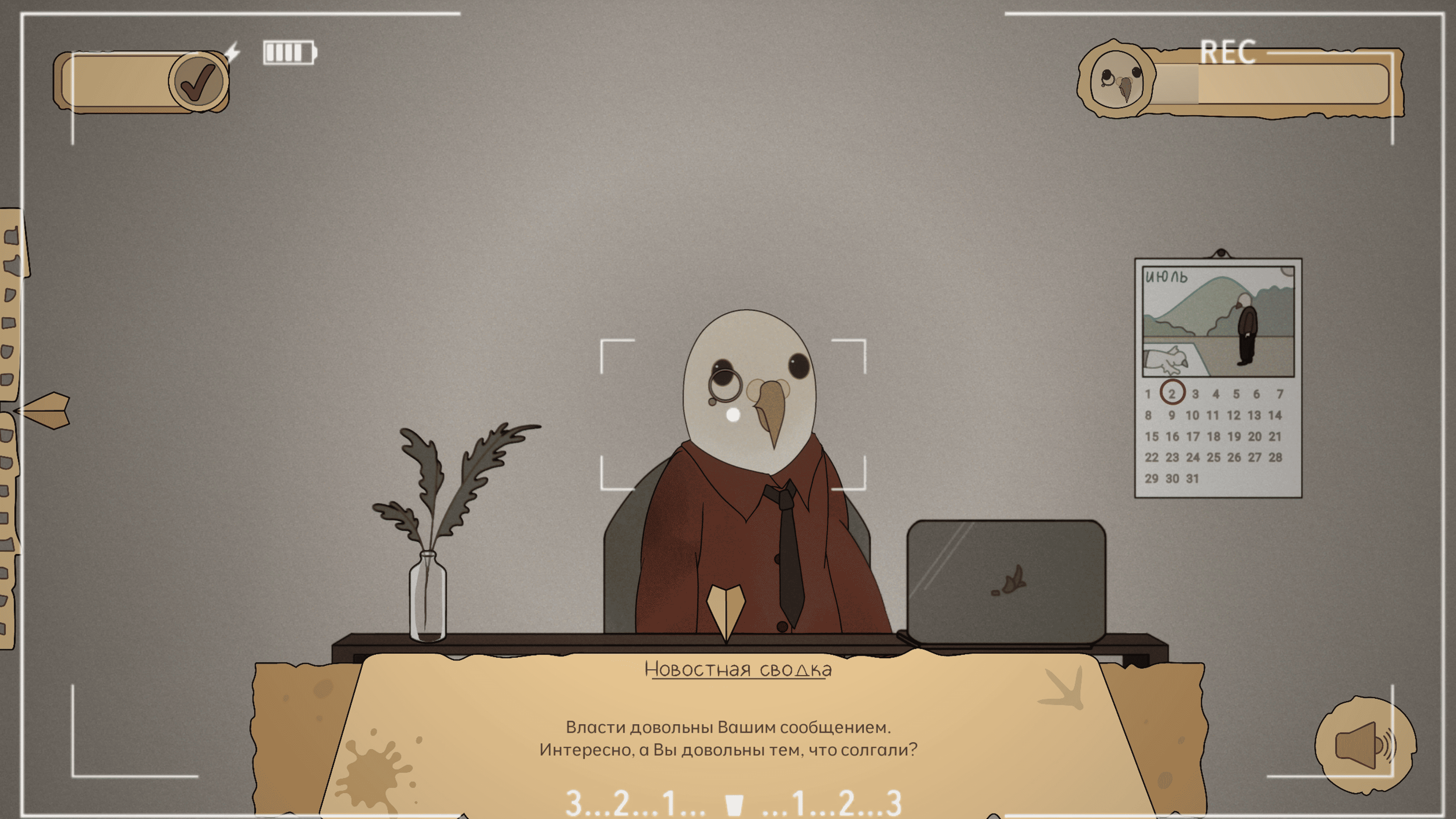 A 2D puzzle game where you are a reporter in a totalitarian state for parrots, who must compose news by listening to sounds and covering all the events that have taken place. Gain the approval of the government by deceiving your fellow citizens, and don't make a mistake to avoid losing your job.